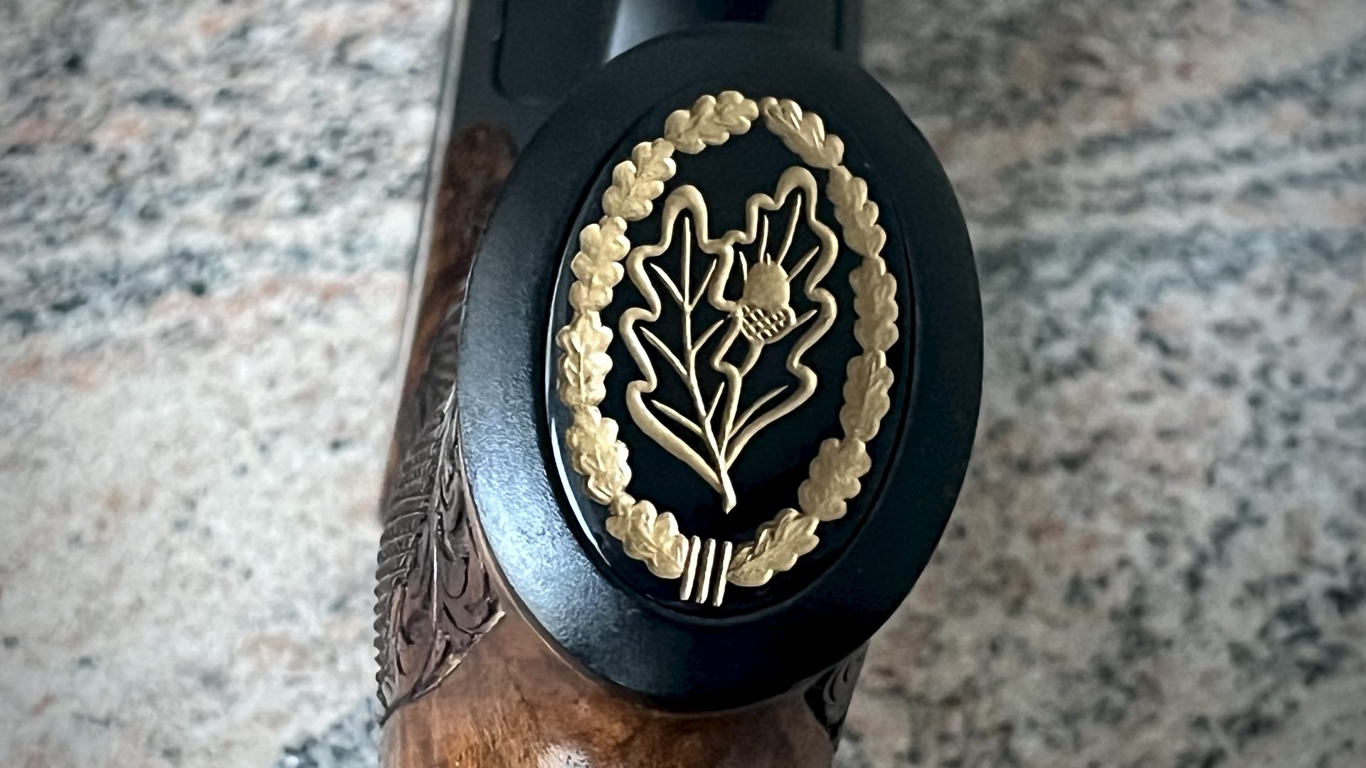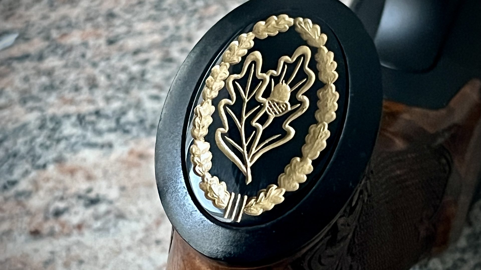 Pistolengriffkäppchen – Blaser Pistolengriffkäppchen mit handgravierten Initialen für die Blaser Professional Success. Die Gravur ist mit Feingoldlack abgesetzt, der Gravurstein mit einem goldfarbenen Rahmen eingefasst.